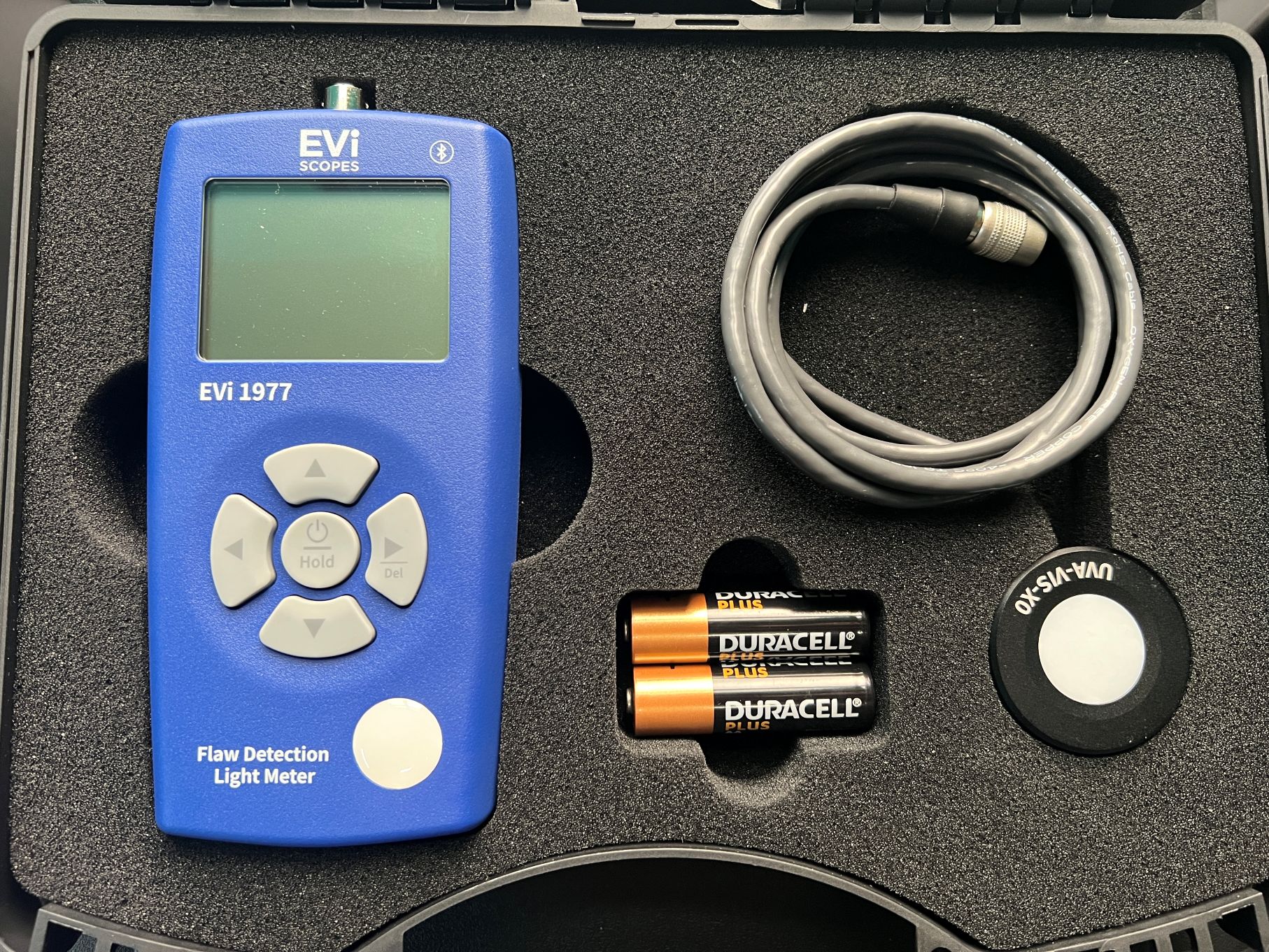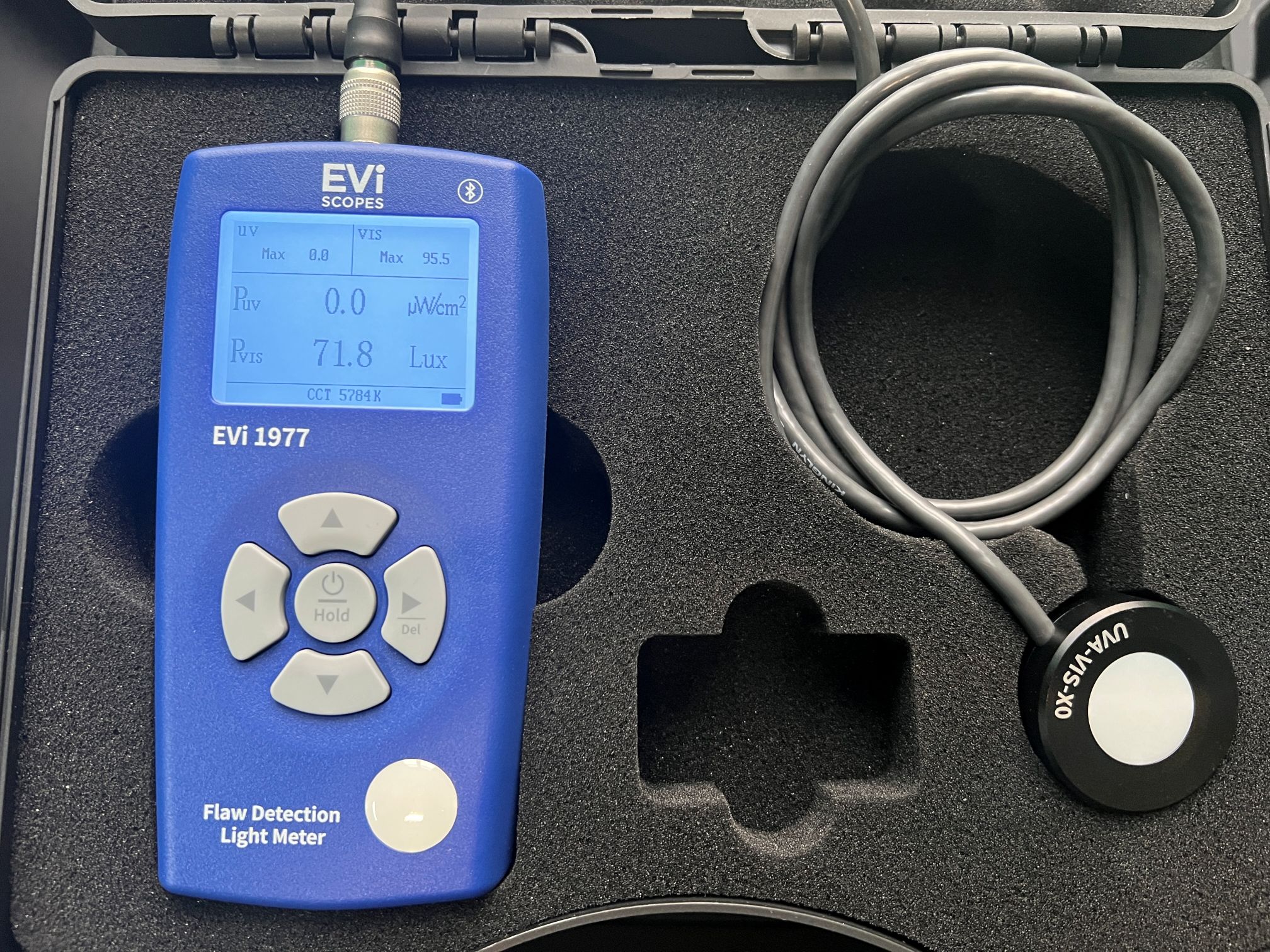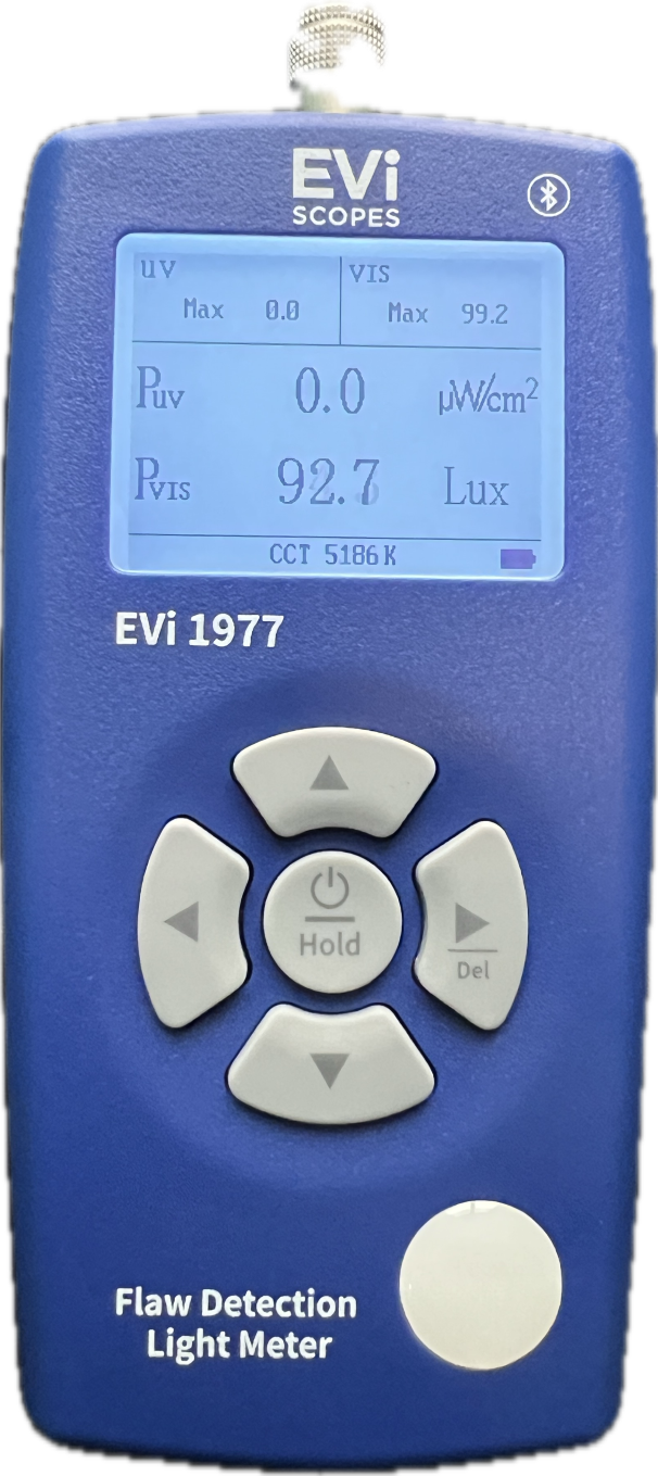 Das EVi 1977 ist ein hochpräzises Intensitätsmessgerät, das speziell für zerstörungsfreie Prüfverfahren (NDT) entwickelt wurde. Es ermöglicht die gleichzeitige Messung von UV-Leistung, sichtbarer Beleuchtungsstärke und korrelierter Farbtemperatur (CCT) – drei entscheidende Parameter für eine zuverlässige Qualitätssicherung bei Penetrations- und Magnetpulverprüfungen.